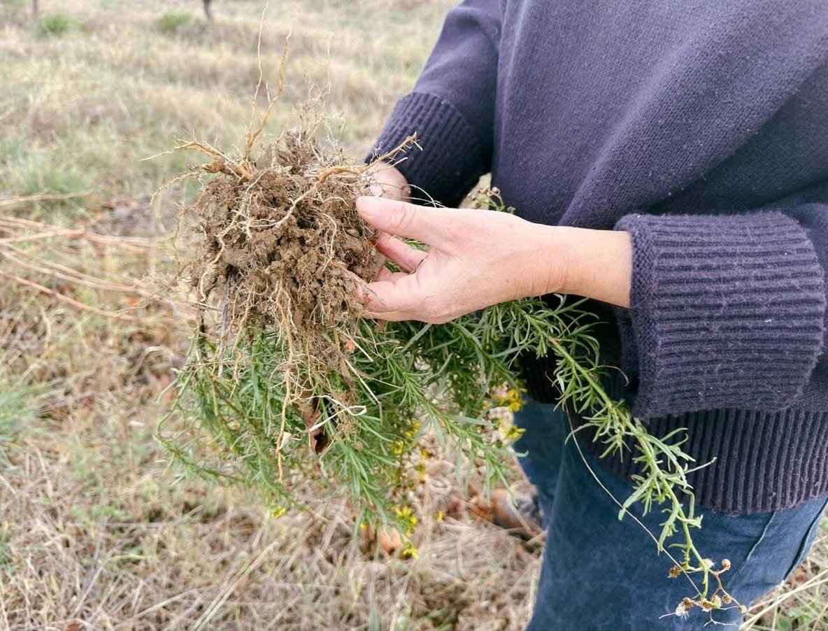 Clos Fantine is a vineyard led by siblings. I spent the bulk of my time with Corine Andrieu. We worked through garrigue-rich terroir—bushy formations of sage, lavender, thyme—and she pointed to oak trees in the distance, explaining how they bring shade and deter fierce winds from the north. Our hands pulled up all manner of growth, studying the soil, fungi, and ant colonies. Further along, into the vines, I munched on arugula from the source while scanning the sprawling, hilly landscape that also raises Mourvèdre, Syrah, Cinsault, and Terret Gris, among others.