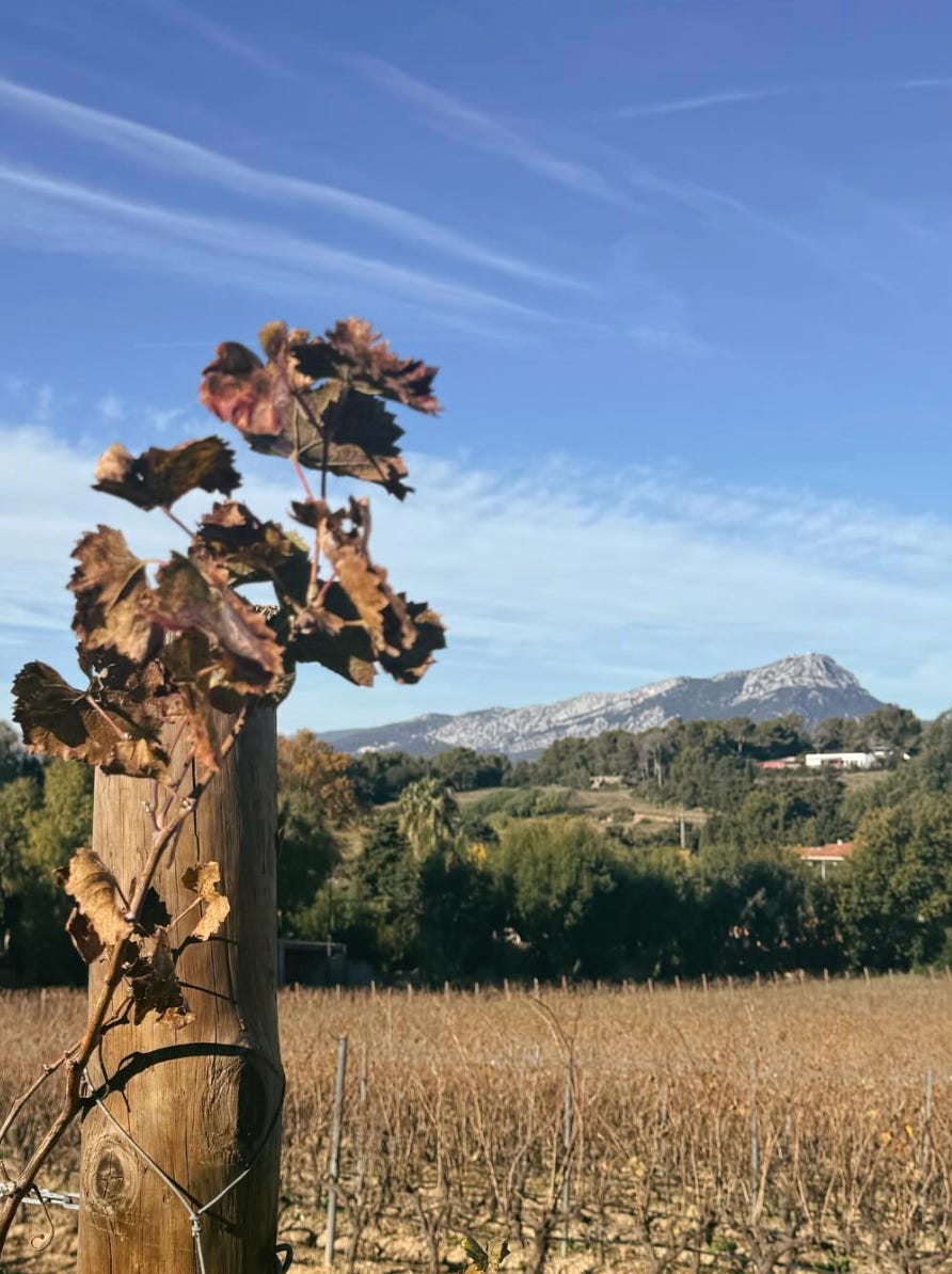 I walked through the post-harvest rows and pathways, over slate and clay soil, picking up glittering quartz, sea glass, tile, and ceramic shards. The Mediterranean Sea was near, though not in sight, throwing out its sea spray over the 18th-century vines, and one could clearly see the mountains of Saint-Baume National Park.